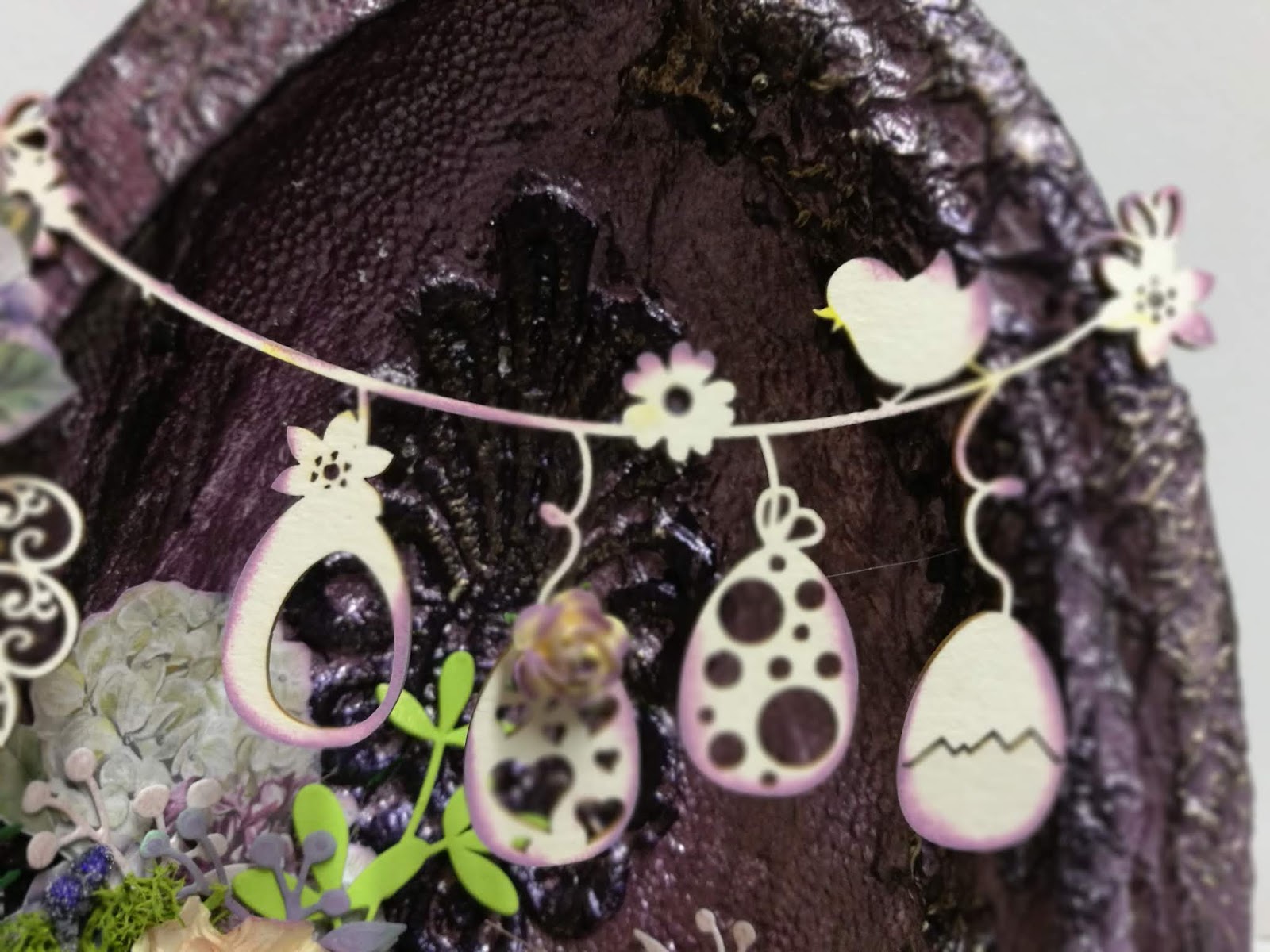Firs I made some texture on my egg. Painted it with Finnabair acrylic paint - Iris Potion and Dark Velvet. Decorated my Egg with some paper flowers and beautiful Scrapiniec chipboards.